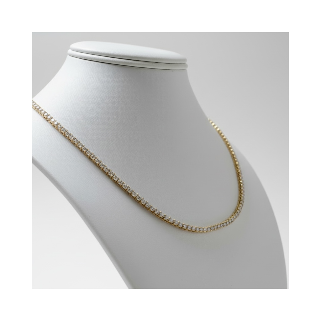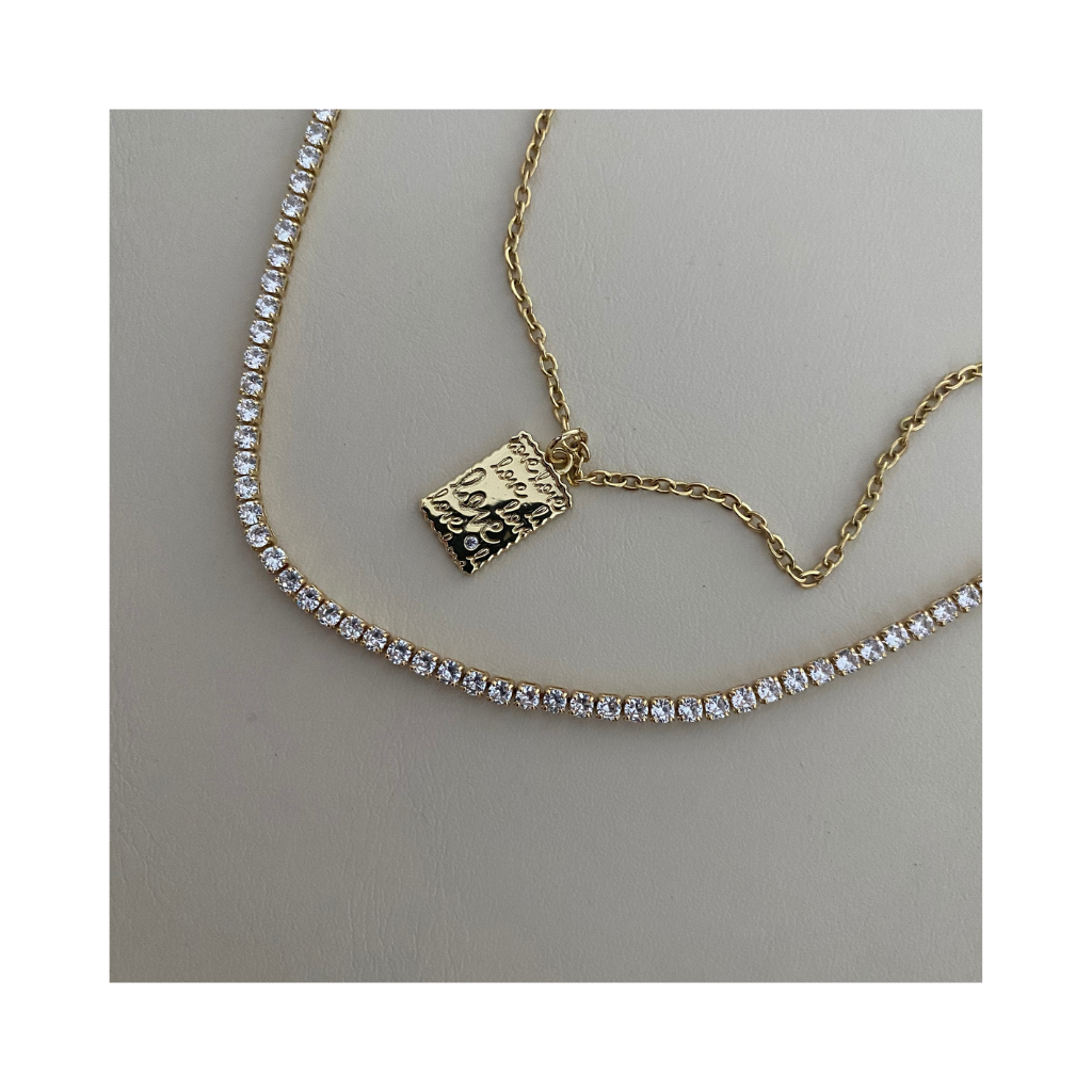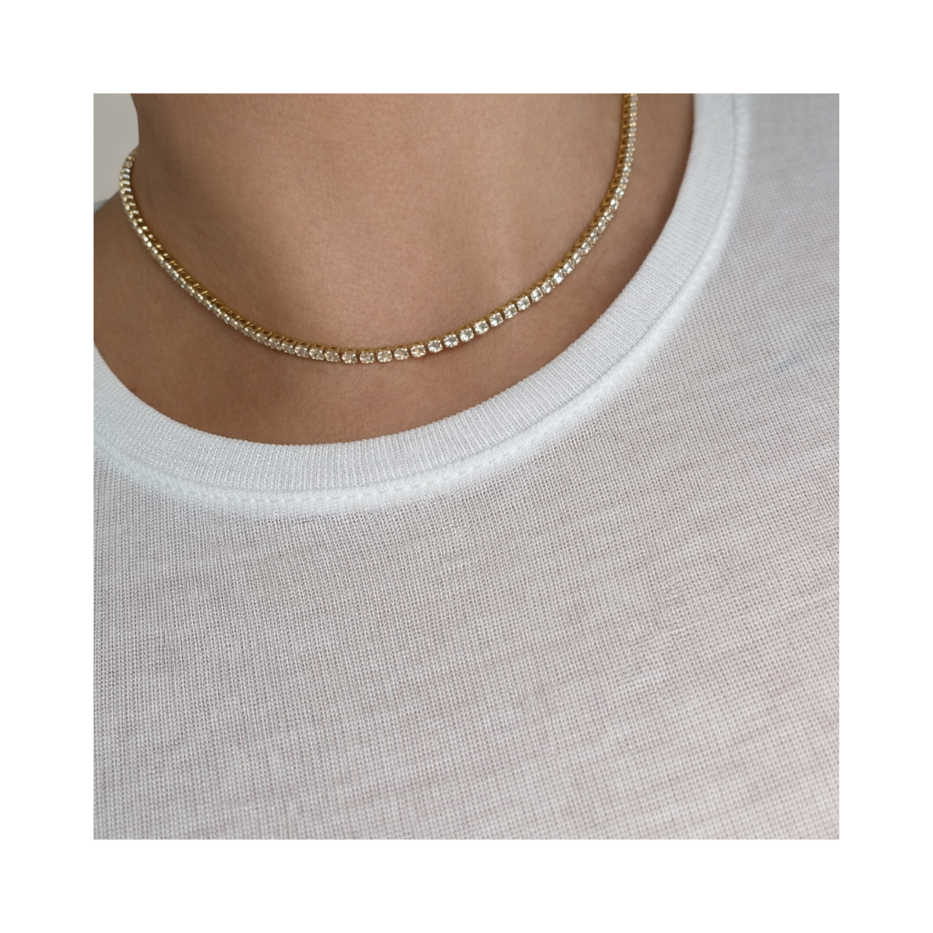 Naszyjnik z drobnych precyzyjnie połączonych ogniw wykonany ze stali szlachetnej pokryty warstwą 14-karatowego złota. Ma ciepły odcień i elegancki połysk. Klasyczny wzór i idealnie wyważony ciepły kolor złota pięknie komponuje się z każdym typem urody i stylizacją. Każda cyrkonia subtelnie odbija światło co daje efekt delikatnego migotania widocznego przy każdym ruchu. Długość naszyjnika to 40cm.