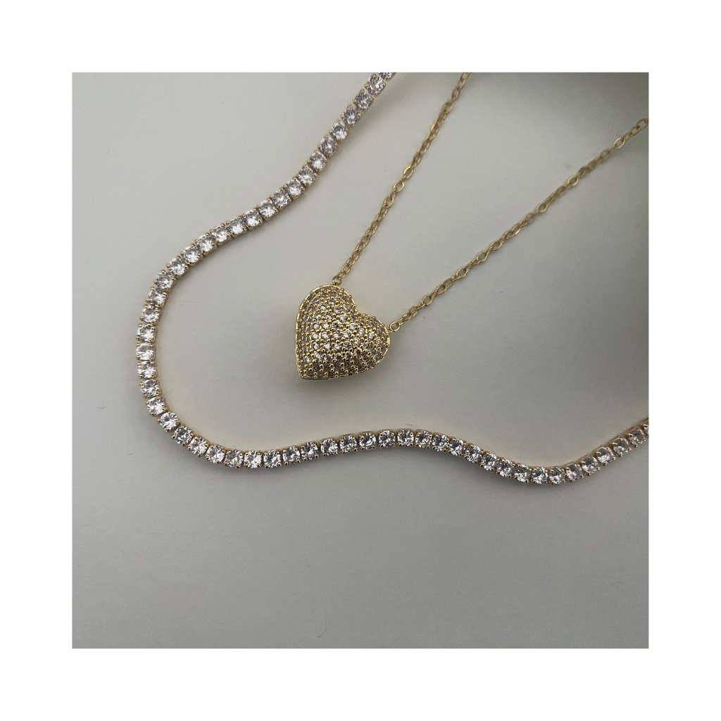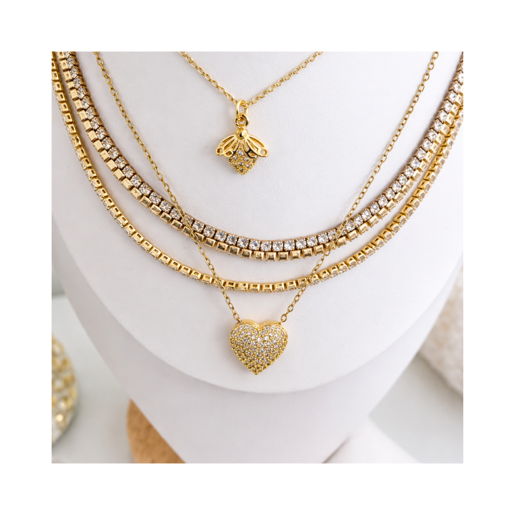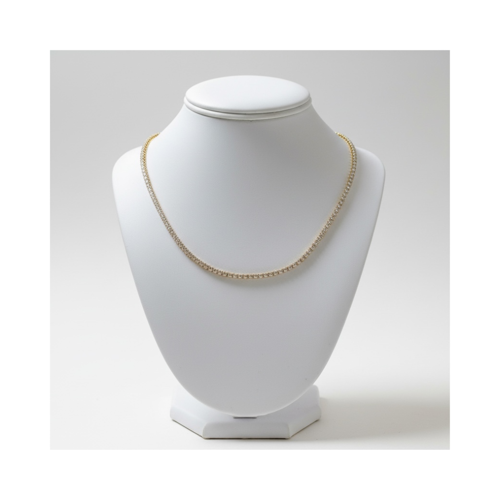 Naszyjnik z drobnych precyzyjnie połączonych ogniw wykonany ze stali szlachetnej pokryty warstwą 14-karatowego złota. Ma ciepły odcień i elegancki połysk. Klasyczny wzór i idealnie wyważony ciepły kolor złota pięknie komponuje się z każdym typem urody i stylizacją. Każda cyrkonia subtelnie odbija światło co daje efekt delikatnego migotania widocznego przy każdym ruchu. Długość naszyjnika to 40cm.